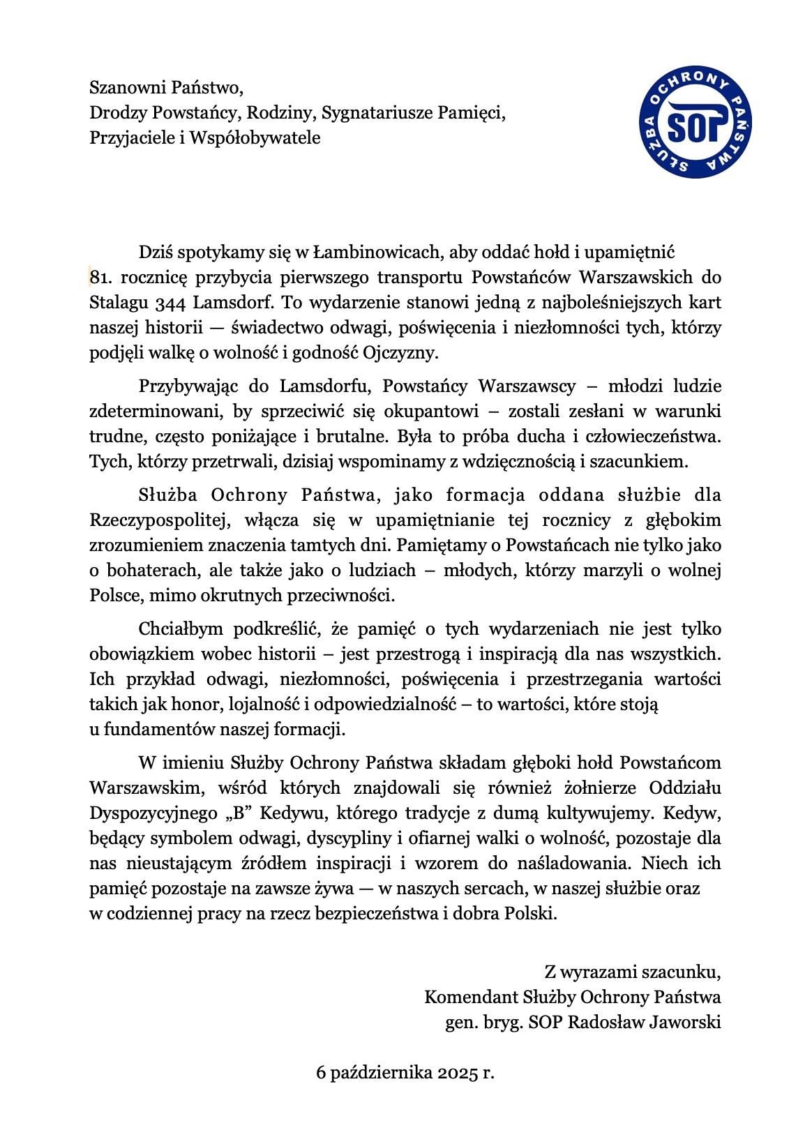 Służba Ochrony Państwa oraz rodziny Oddziału Dyspozycyjnego "B" Kedywu uczestniczyły w uroczystych obchodach 81. rocznicy przybycia pierwszego transportu Powstańców Warszawskich do Stalagu 344 Lamsdorf. W imieniu Komendanta SOP gen. Radosława Jaworskiego naszą formację reprezentowali kpt. Mateusz Perehubka oraz Przemysław Jaskółowski.